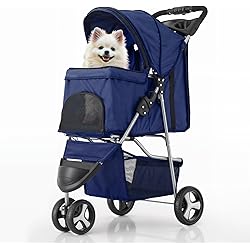 MoNiBloom 3 Wheels Pet Stroller, Foldable Dog Cat Cage Jogger Stroller with Weather Cover for All-Season, Storage Basket and Cup Holder, Breathable and Visible Mesh for Small/Medium Pets, Blue